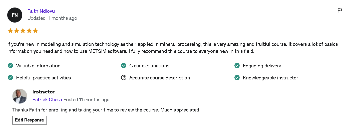 “Just completed the Level 1 training on Process Simulation and Modelling in METSIM. Enjoyed every moment of the learning process. From the user interface, to the module content and practicals, it gives quite an informative introduction into simulation techniques in mineral processing. Definitely looking forward to Level 2. Highly recommend this course for individuals interested in process modelling using simulation software.